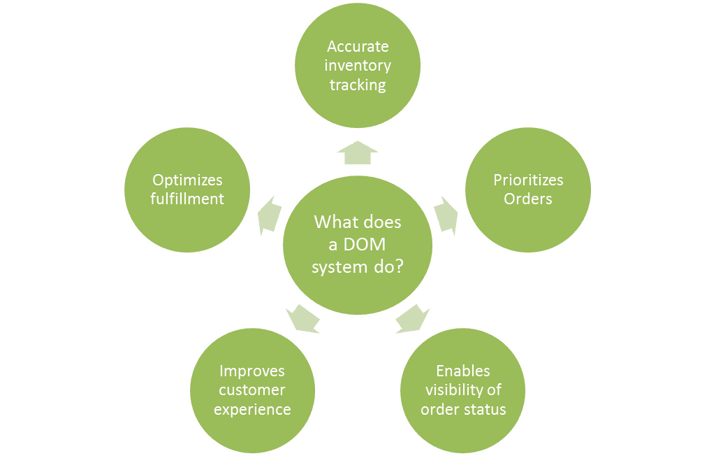 A DOM system facilitates offline and online fulfillment, by aggregating, managing and fulfilling orders – as and where the customers want.